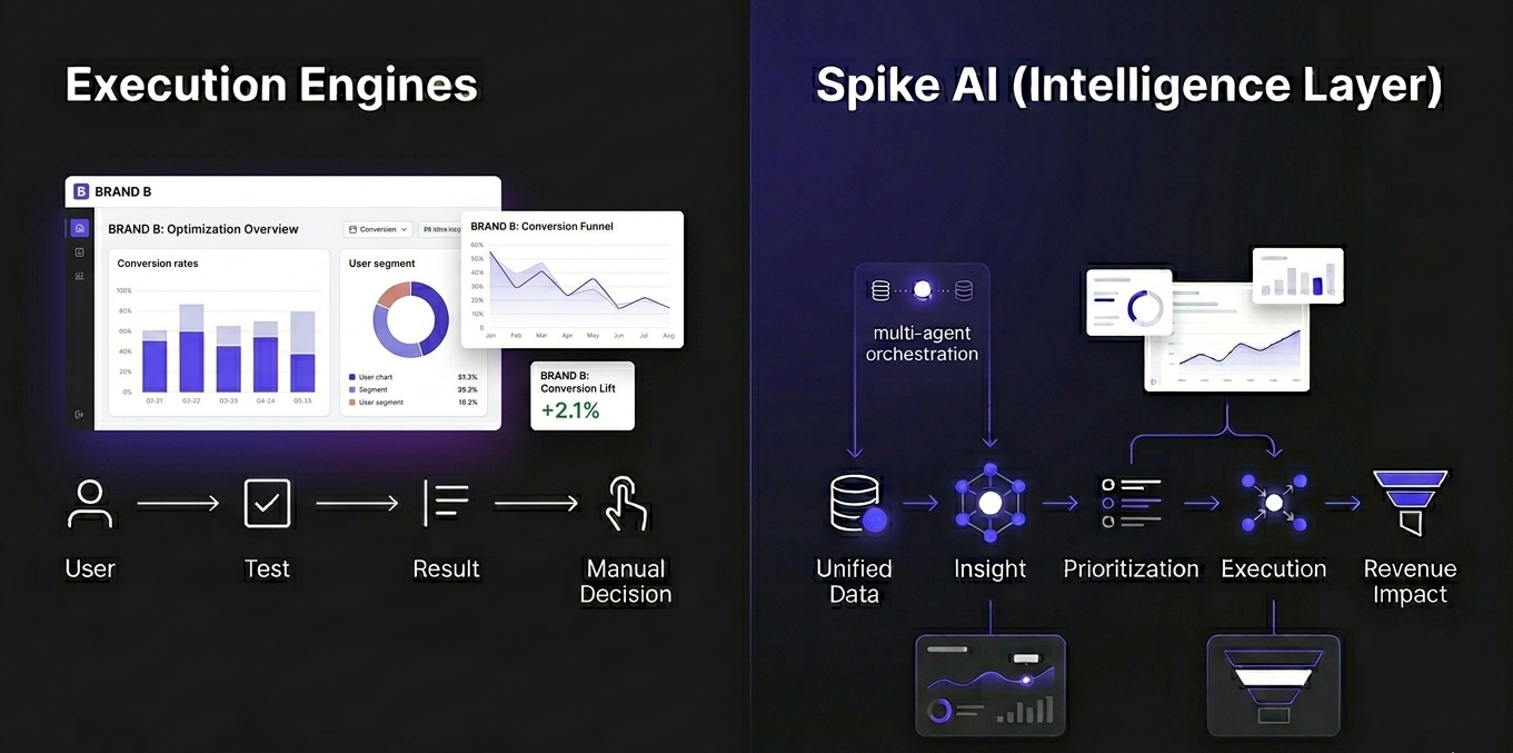 When we look at the core use of these Optimizely alternatives, a clear split appears. We see Execution Engines like VWO, Unbounce, Mutiny, and AB Tasty. Then we see an Intelligence Layer like Spike AI.